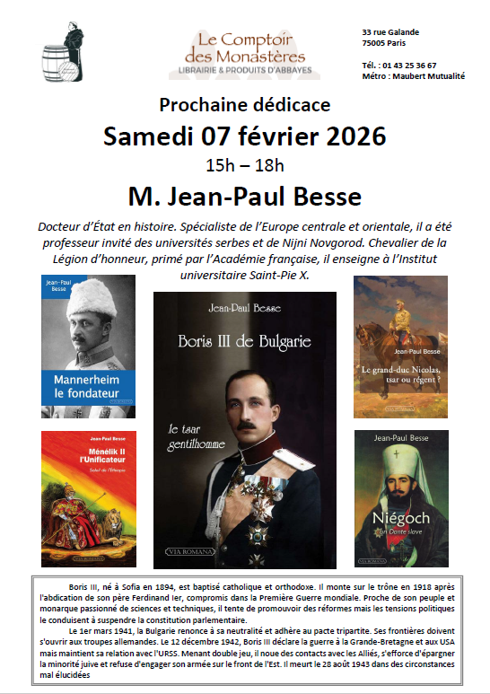 Nous aurons la joie et l'honneur d'accueillir le samedi 07 février prochain M Jean-Paul BESSE qui viendra dédicacer son tout dernier livre "Boris III de Bulgarie, le tsar gentilhomme" ainsi que divers ouvrages.