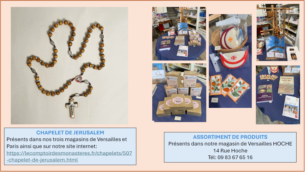 Vous trouverez chez nous des articles fabriqués directement par ces communautés qui sont toujours présentes en Terre Sainte depuis l'origine de la Chrétienté et qui souffrent particulièrement aujourd'hui !!