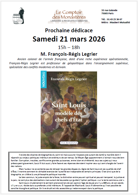 Nous aurons la joie et l'honneur d'accueillir le samedi 21 mars prochain M François-Régis Legrier qui viendra dédicacer son tout dernier livre "Saint Louis, modèle des chefs d'Etats" ainsi que son précédent ouvrage "Si tu veux la paix prépare la guerre"